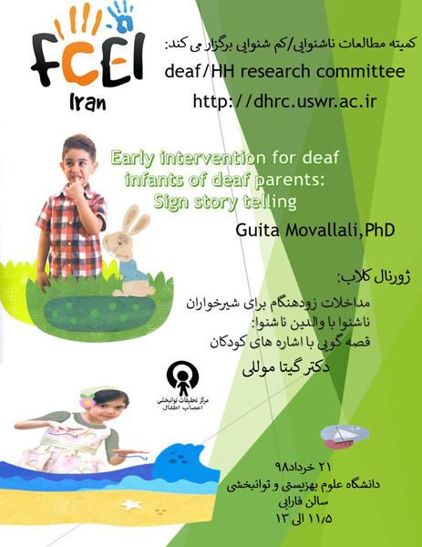 گفتنی است، ژورنال کلاب " مداخلات زودهنگام برای شیرخواران ناشنوا با والدین ناشنوا: قصه گویی با اشاره های کودکان " با همکاری مرکز تحقیقات توانبخشی اعصاب اطفال و انجمن علمی دانشجویان روانشناسی و آموزش کودکان استثنایی و با حمایت معاونت تحقیقات دانشگاه علوم بهزیستی و توانبخشی  از ساعت 11/30 الی 13  روز 21 خردادماه در سالن فارابی این دانشگاه برگزار خواهد شد.