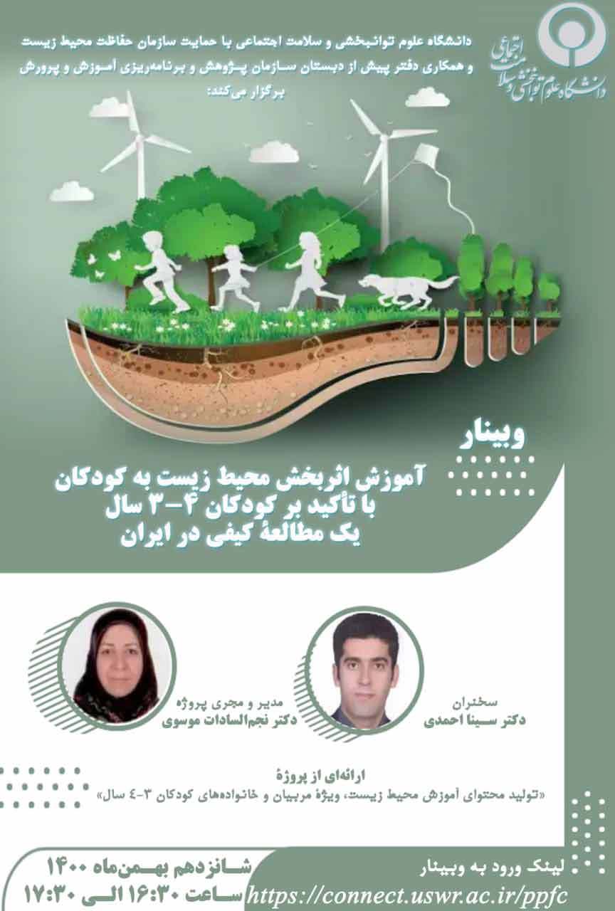 صاحبنظران، مربیان و متخصصان مسایل محیط زیست و حوزه آموزش کودکان پیش از دبستان برای شرکت در این وبینار می توانند از طریق لینک   https://connect.uswr.ac.ir/ppfc   اقدام کرده و از نتایج مطالعه کیفی انجام شده که در ایران و کشورهای جهان بی سابقه است، استفاده کنند.