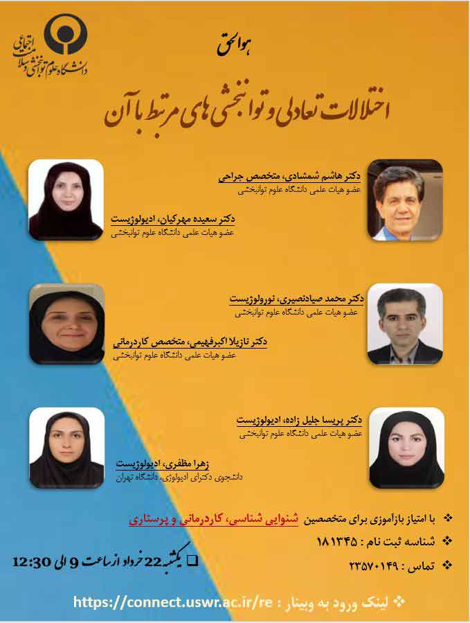 این گزارش همچنین حاکیست، " دکتر هاشم شمشادی متخصص جراحی، دکتر سعیده مهرکیان ادیولوژیست، دکتر محمد صیادنصیری نورولوژیست، دکتر نازیلا اکبرفهیمی متخصص کاردرمانی، دکتر پریسا جلیل زاده ادیولوژیست و زهرا مظفری دانشجوی دکترای ادیولوژی " سخنرانان این وبینار هستند.