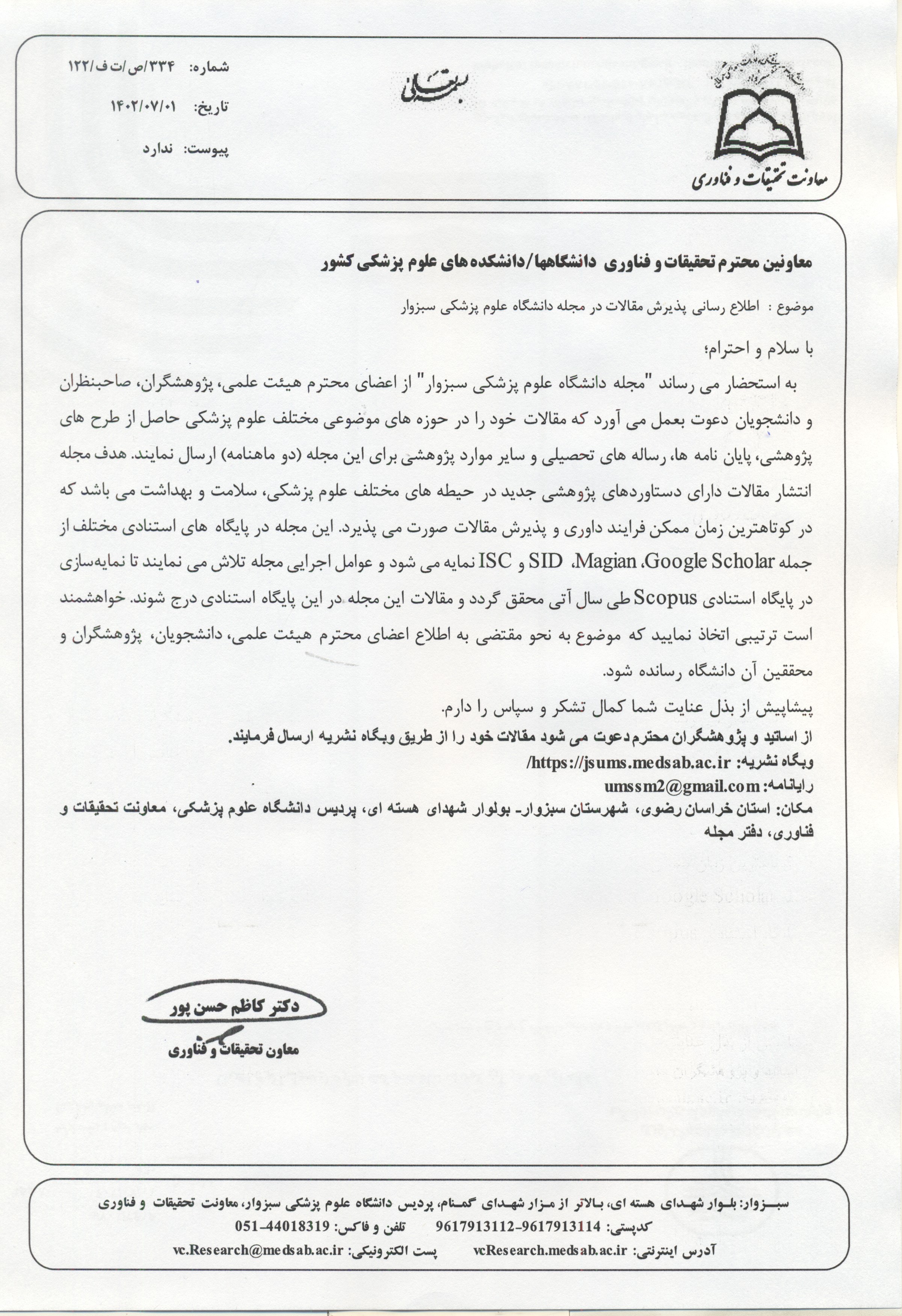 اطلاع رساني پذيرش مقالات در مجله دانشگاه علوم پزشكي سبزوار