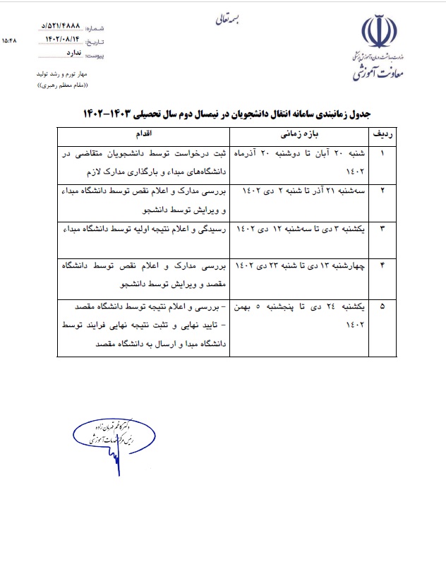 برنامه زمانبندی سامانه نقل و انتقال دانشجویان در نیمسال دوم 1403-1402