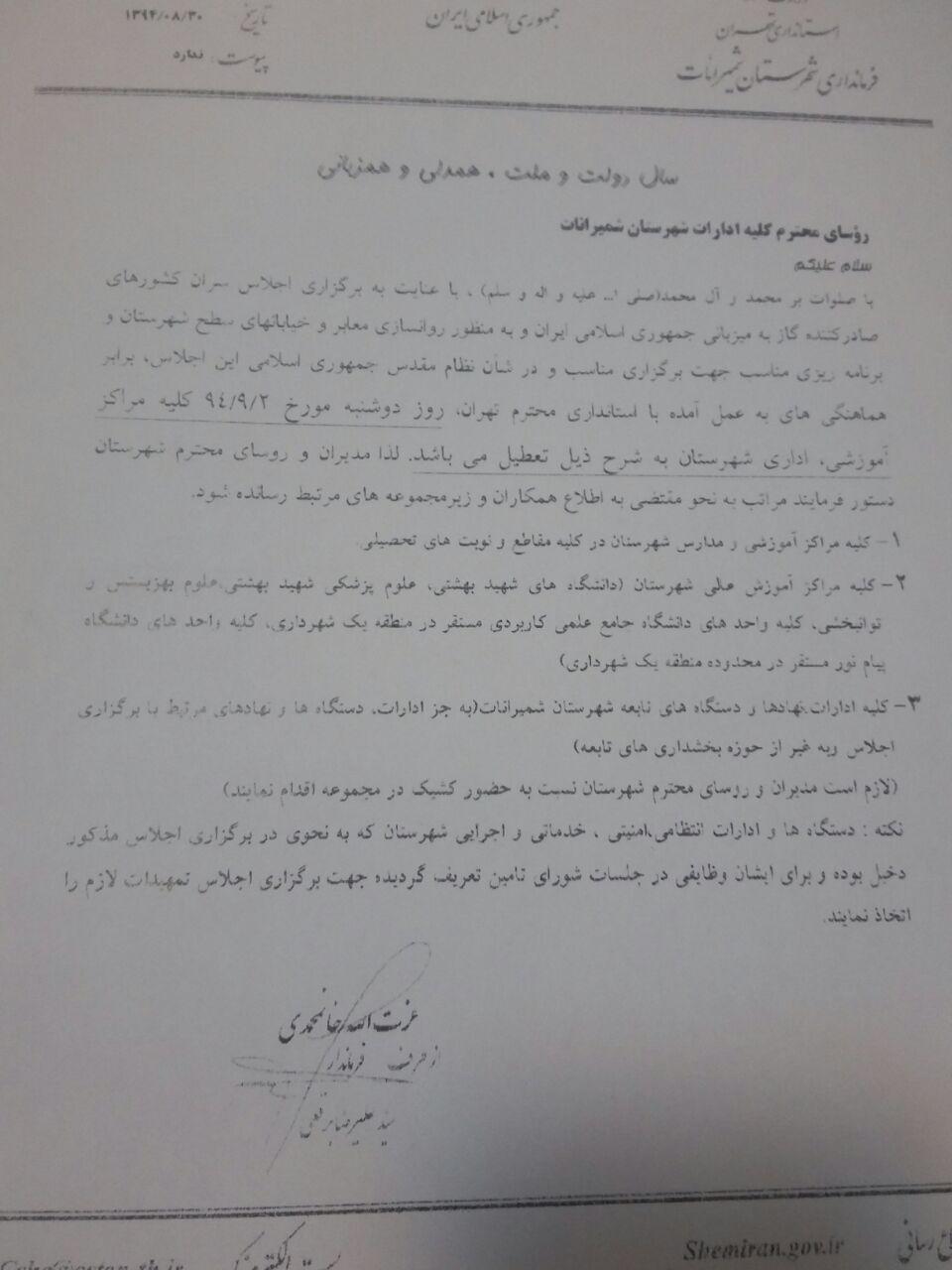 اخبار > طبق اعلام فرمانداری شمیرانات، دوشنبه 2 آذرماه 94 تمامی مراکز آموزشی و اداری منطقه 1 تهران، از جمله دانشگاه علوم بهزیستی و توانبخشی تعطیل است