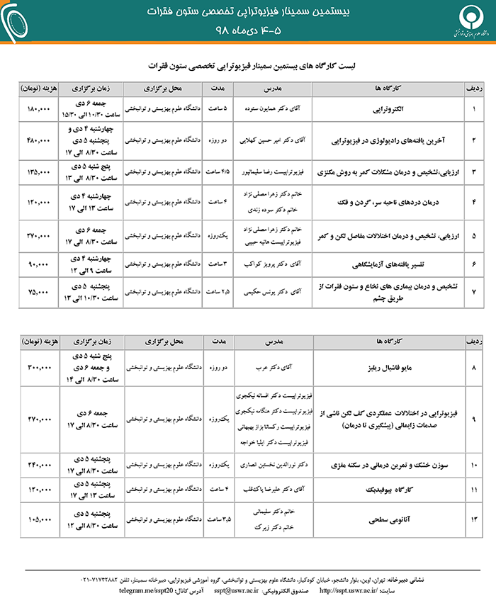 در آستانه برگزاری بیستمین سمينار فيزيوتراپى تخصصى ستون فقرات به اطلاع فارغ التحصیلان و دانشجویان رشته فیزیوتراپی میرساند برگزاری کارگاههای آموزشی و کاربردی متنوع زیر برنامهریزی شده است. برای اطلاع از جزئیات کامل هر کارگاه شامل اسامی اساتید و مدرسین، سرفصلهای آموزشی، تاریخ برگزاری، هزینه و نحوه پرداخت آن میتوانید بر روی عنوان هر کارگاه کلیک فرمایید.
